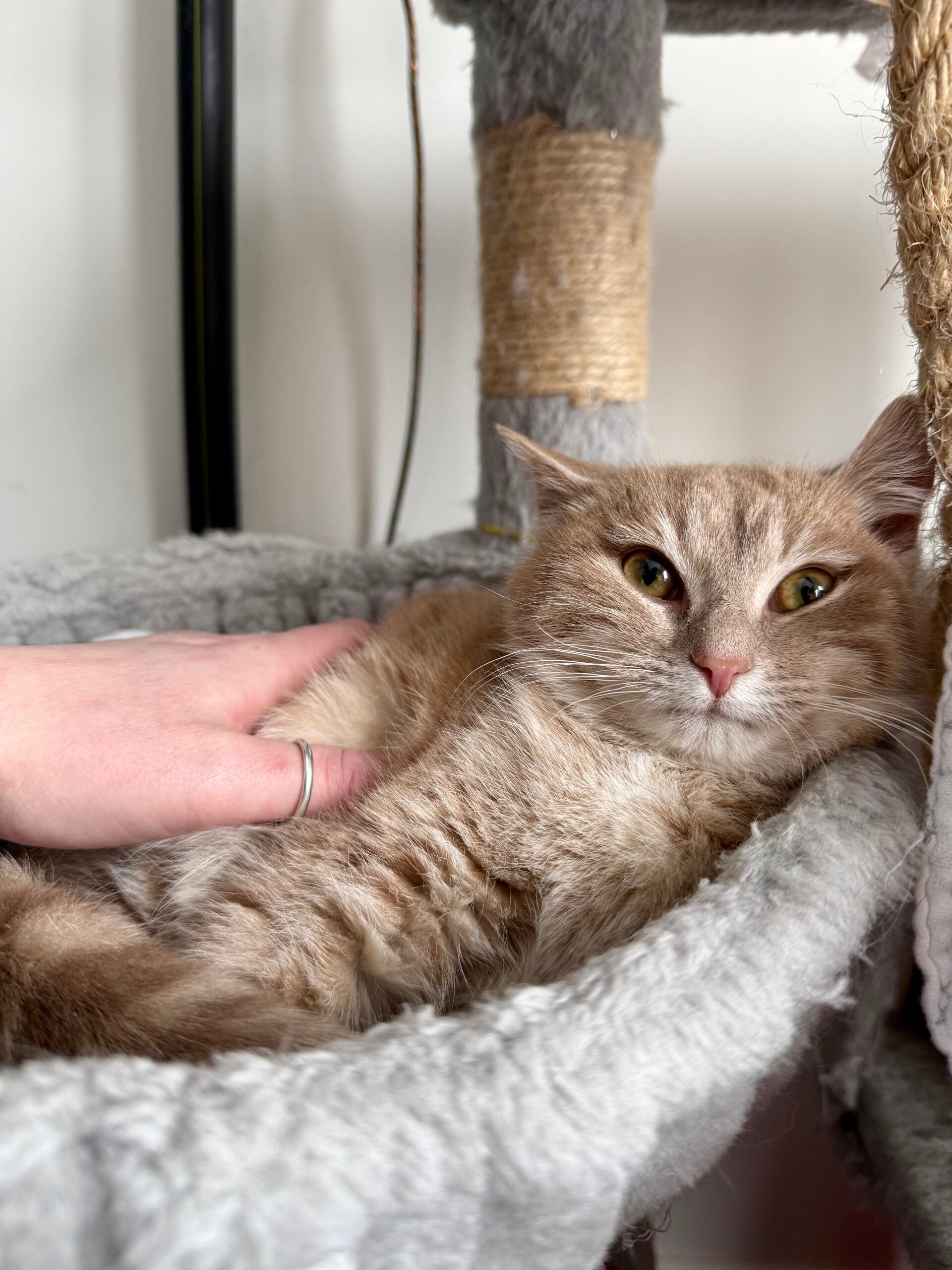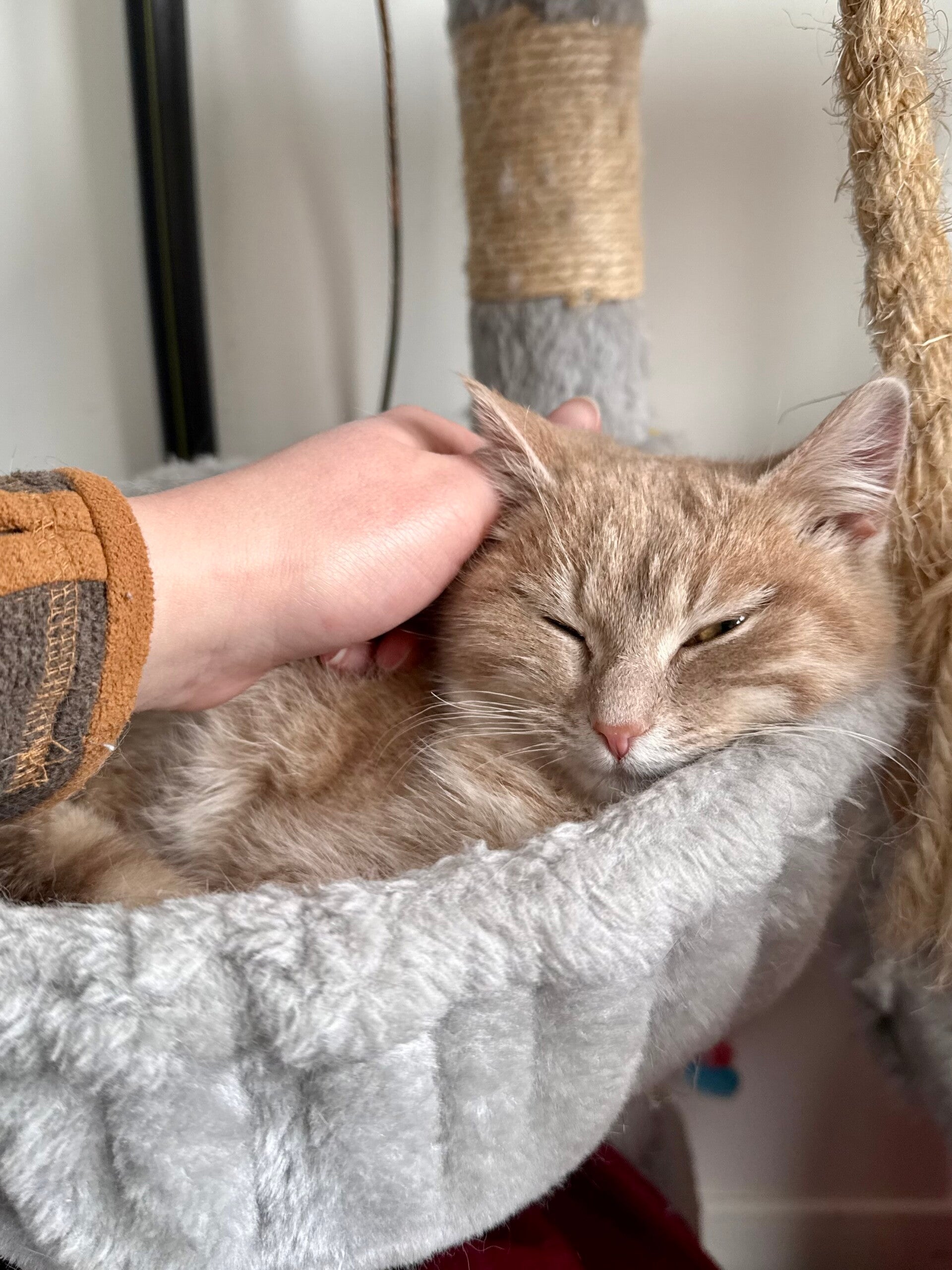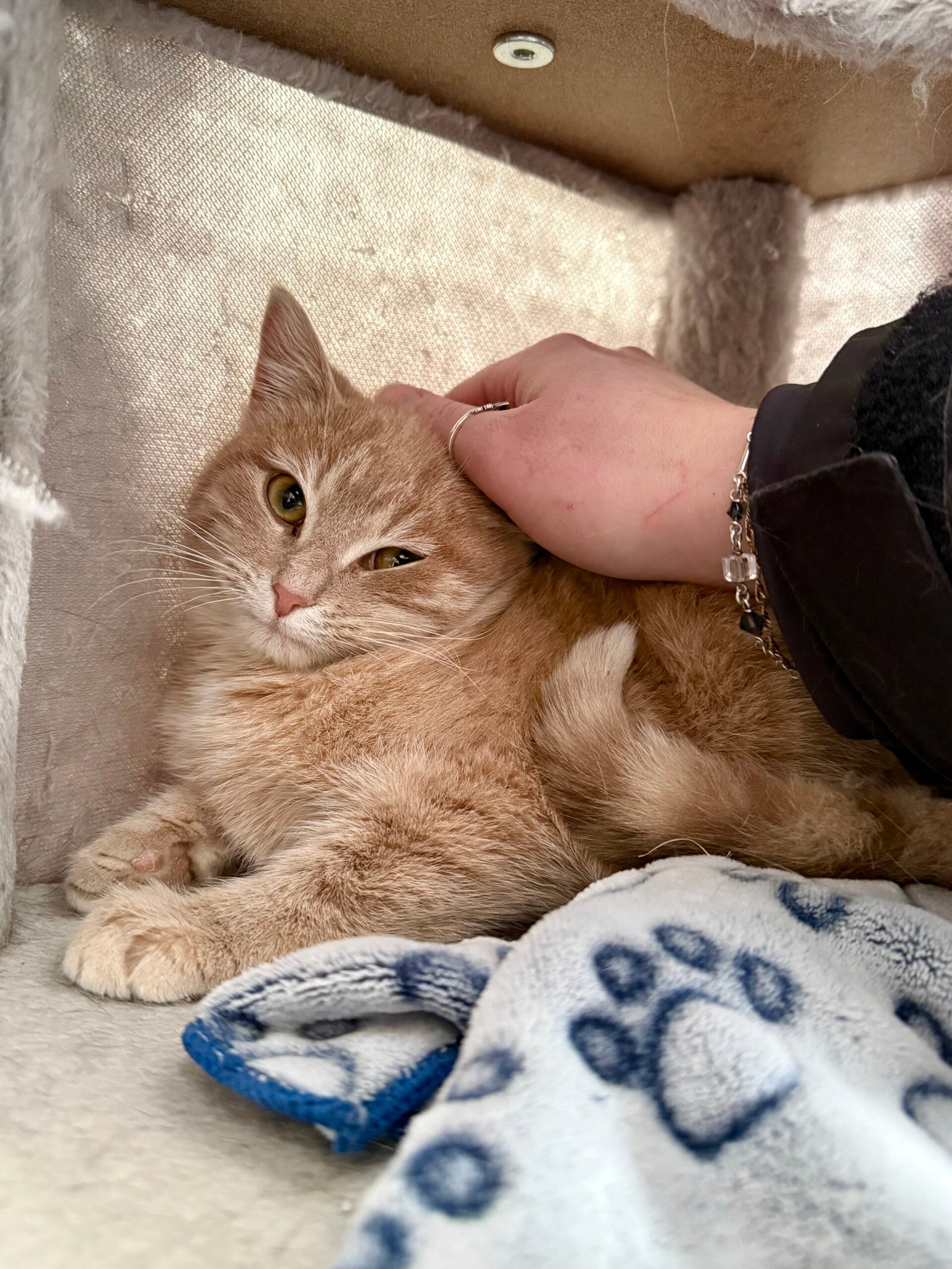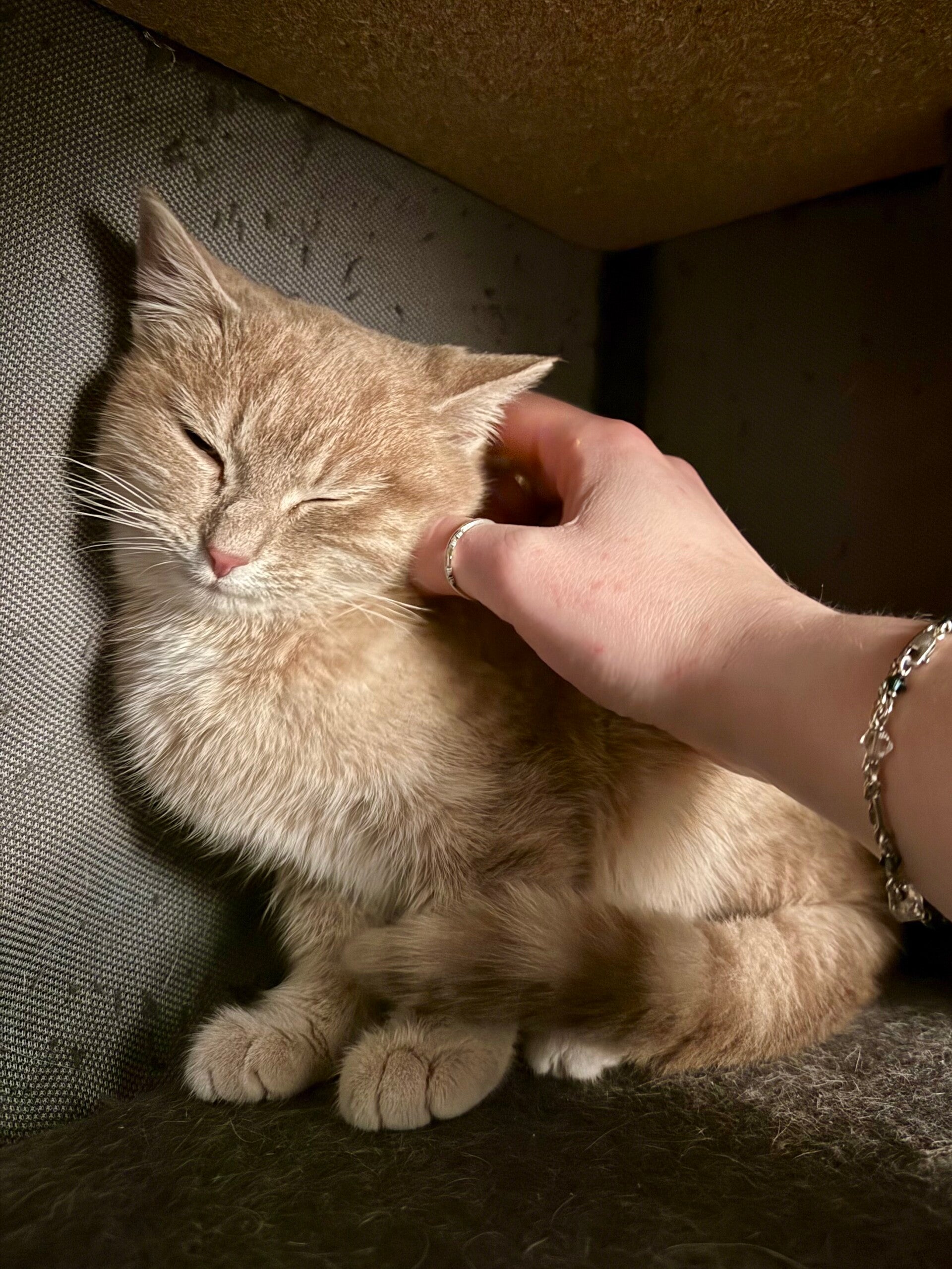 Sarah is a young cat who is still a little shy, but with a wonderfully gentle temperament. She is slowly learning to trust humans. Each day, she allows herself to be handled more easily and enjoys these tender moments more and more, purring nonstop when she feels safe and comfortable.